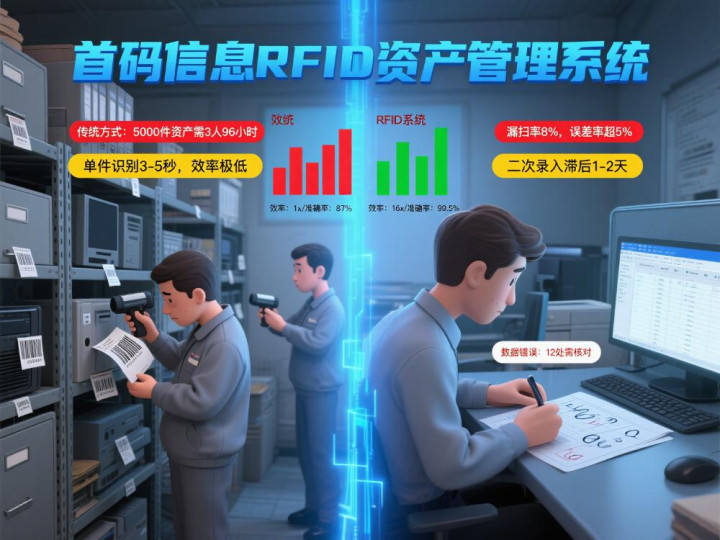 传统资产盘点多依赖人工扫码、纸质记录或 Excel 台账,在资产数量增多、场景复杂后,效率短板逐渐凸显。而 RFID 系统通过自动识别、批量读取、数据实时同步,从根本上优化盘点流程。对比两者可知,传统方式的效率短板主要集中在识别速度、数据准确性、场景适配性三个方面,这些短板在中大型资产规模场景中尤为明显。